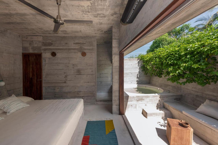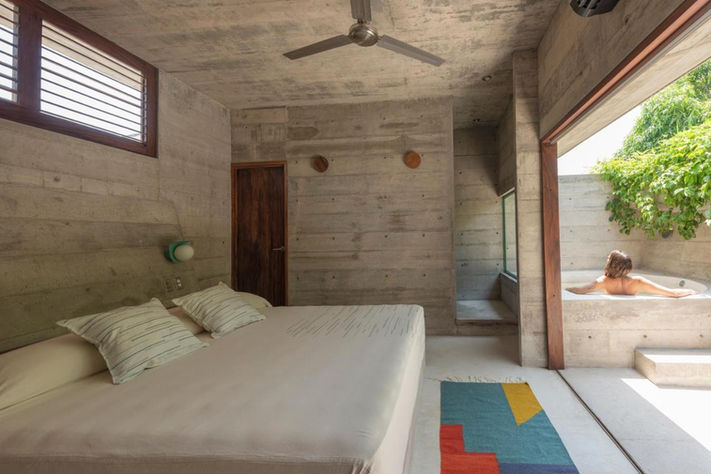 À l'étage, des suites plus spacieuses profitent de leur espace extérieur avec jacuzzi privatif, entre verdure et béton brut. L'atout parfait pour profiter au mieux des chaudes après-midis de Puerto Escondido !
