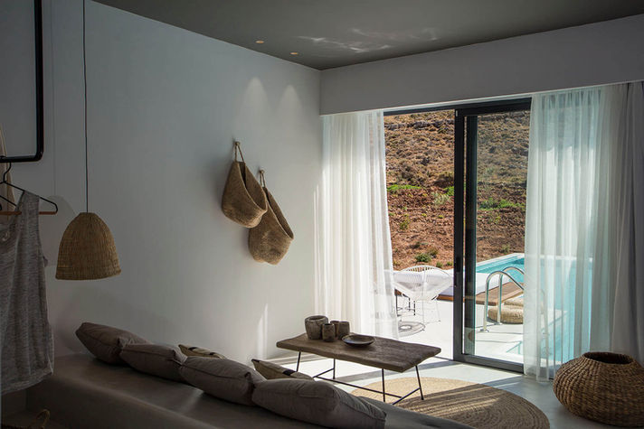 Toutes les chambres du Casa Cook Rhodes proposent une ambiance bohème-chic, mélant tons ocres et béton cirée. Chaque chambre dispose d'une terrasse privative, offrant deux transats design donnant sur l'un des longs bassins de l'hôtel.