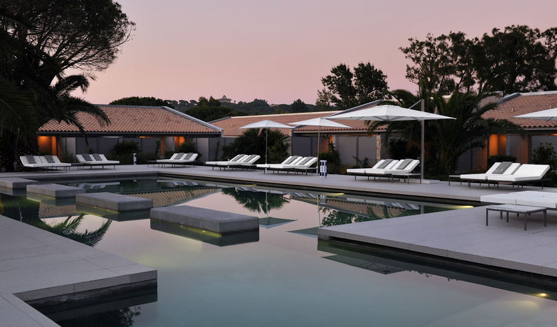 Entouré par un jardin de palmiers verdoyants, le Sezz s'articule autour d'une large piscine centrale parsemée de meubles lounge, invitant à une détente totale sous le soleil de Saint-Tropez.